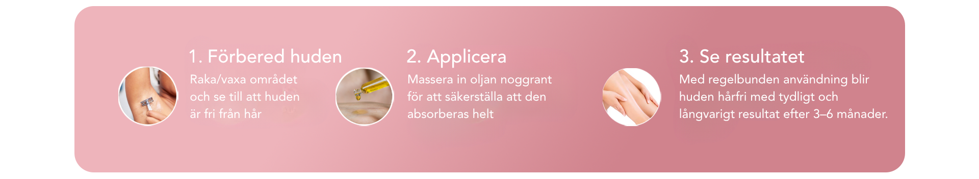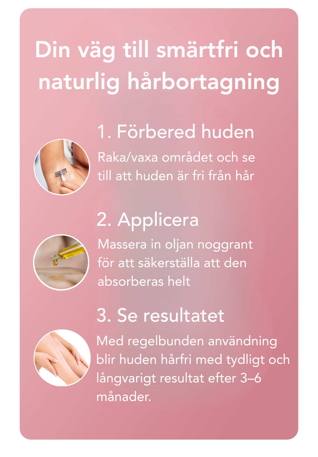 Applicera oljan regelbundet på kvällar och se hur huden successivt blir jämn, silkeslen och helt fri från oönskat hår.