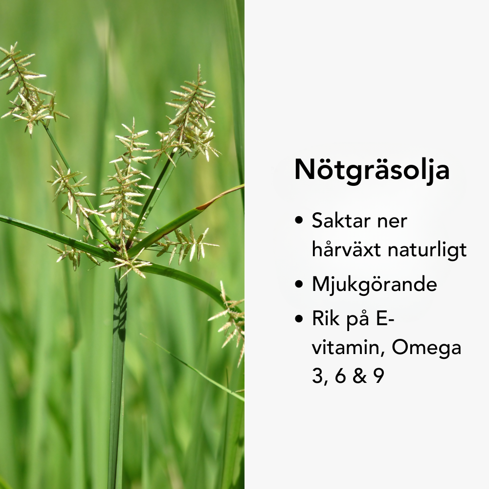 Vår formula bygger på nötgräsolja, känd för sina hårväxthämmande egenskaper och sin förmåga att göra huden mjuk och slät.