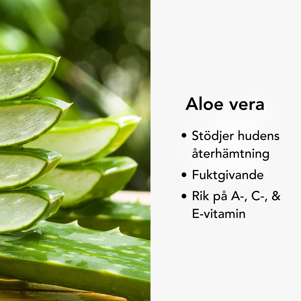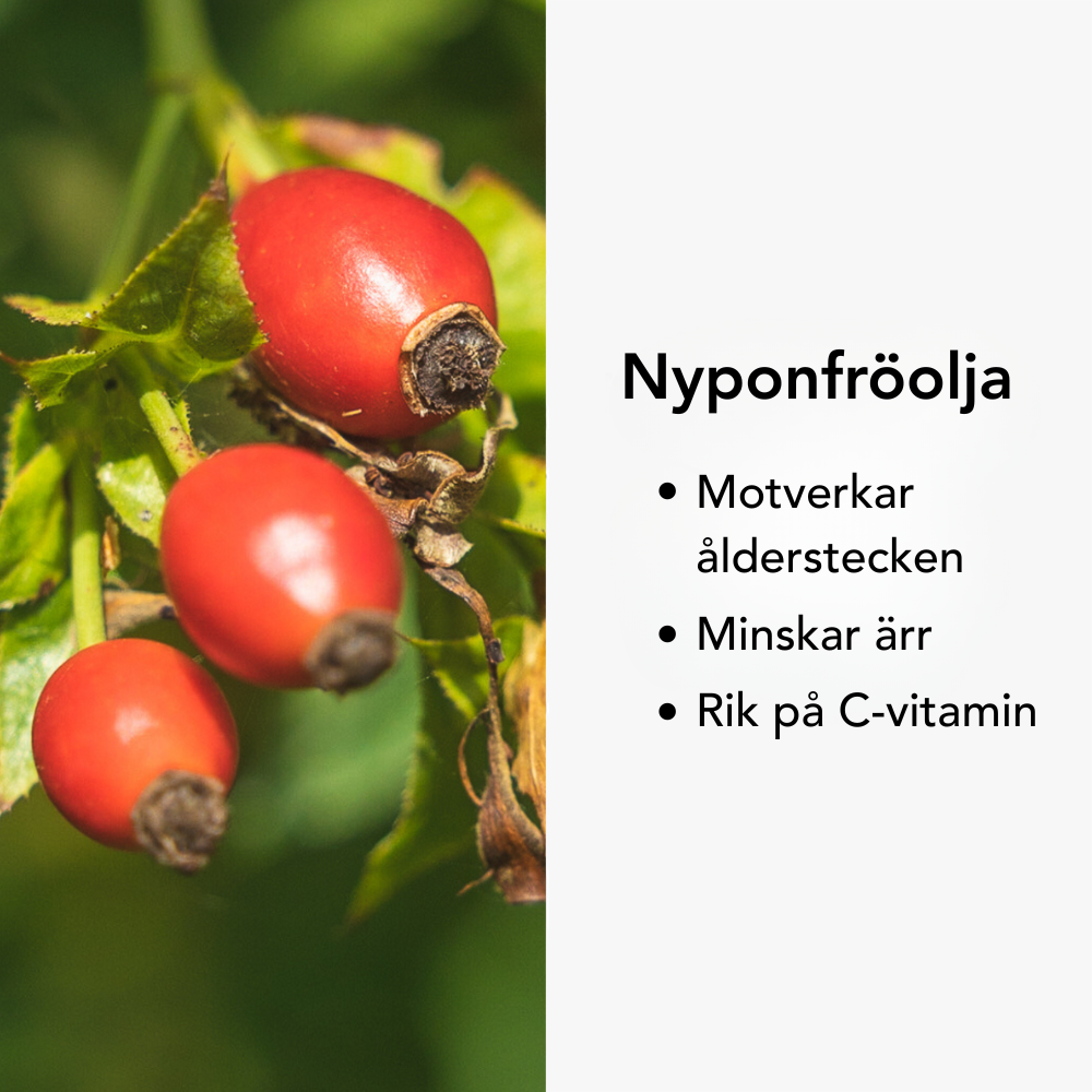 Den kompletteras av jojobaolja, sötmandelolja och nyponfröolja som återfuktar, mjukgör och tillför viktiga vitaminer och antioxidanter, tillsammans med aloe vera som bidrar till en fräsch och välmående hud.